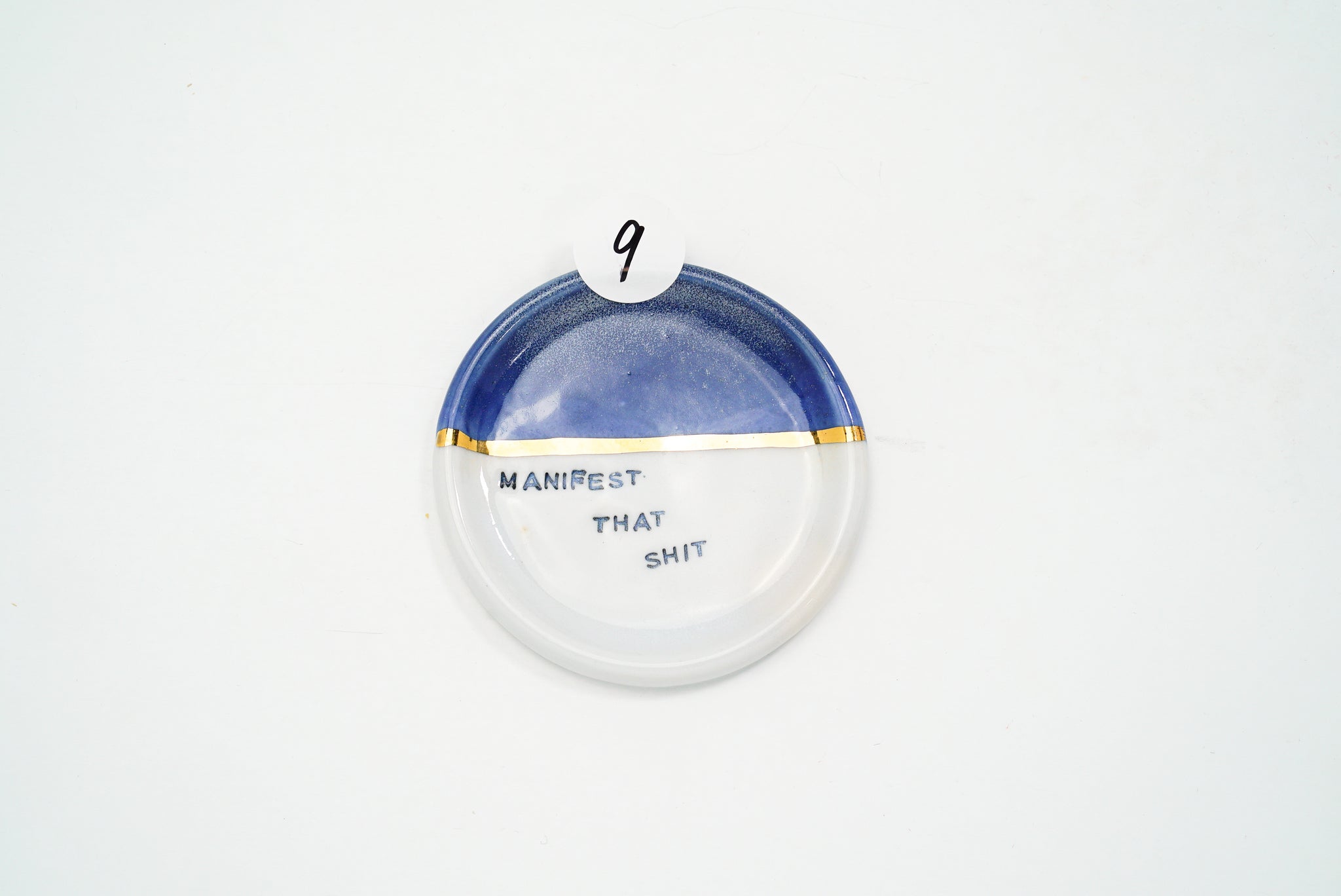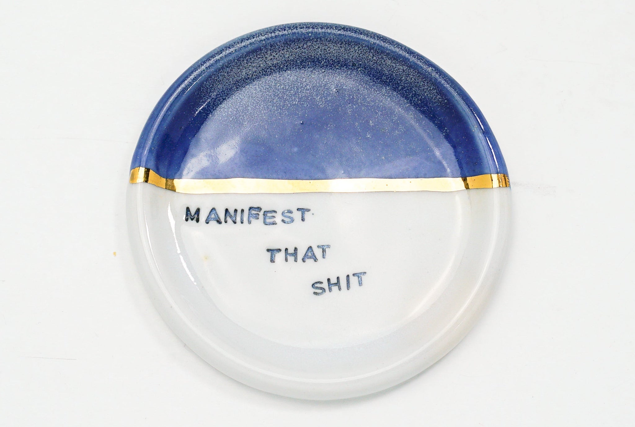 This piece is a part of the Manifest Dish Collection made of porcelain clay and 22k gold. These are hand stamped with individual letters, inlayed with black underglaze, sanded multiple times throughout several stages, hand-painted gold luster, and are made with the intention to remind you of what's possible through intention, grit, and determination. This is the last batch of my OG Manifest Dishes as I make room for new work.