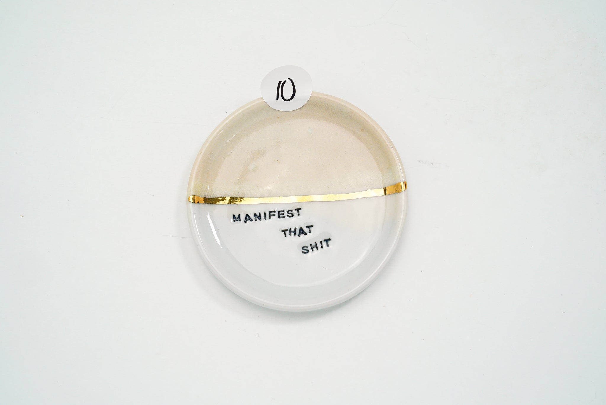This piece is a part of the Manifest Dish Collection made of porcelain clay and 22k gold. These are hand stamped with individual letters, inlayed with black underglaze, sanded multiple times throughout several stages, hand-painted gold luster, and are made with the intention to remind you of what's possible through intention, grit, and determination. This is the last batch of my OG Manifest Dishes as I make room for new work.
